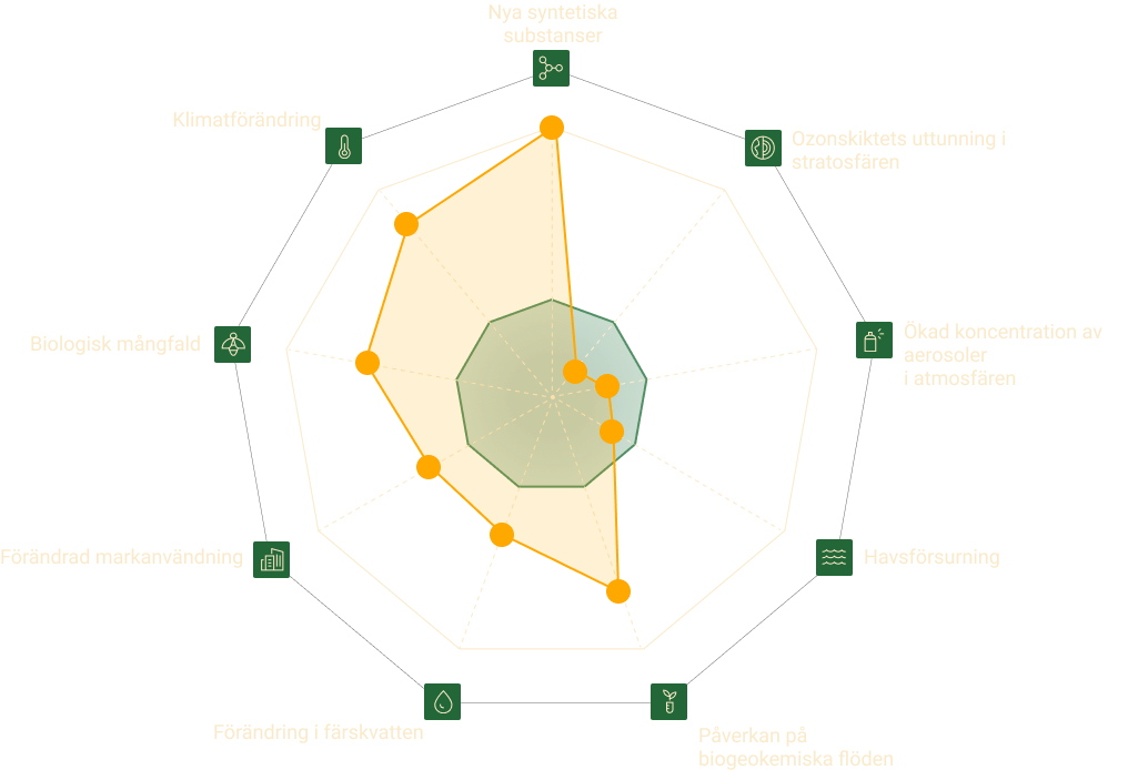 I Planetens Gränser kan man se vår planet som en patient där hela kroppen måste må bra. Det finns nio områden där jorden måste ha sund balans och inte gå över ohållbara gränser. Genom att identifiera och kvantifiera dessa viktiga planetära system och hålla dem inom hållbara nivåer undviker vi kritiska förändringar i jordens miljö. I den senaste kartläggningen i september 2023 hade 6 av 9 gränser överskridits, Stockholm Resilience Centre.